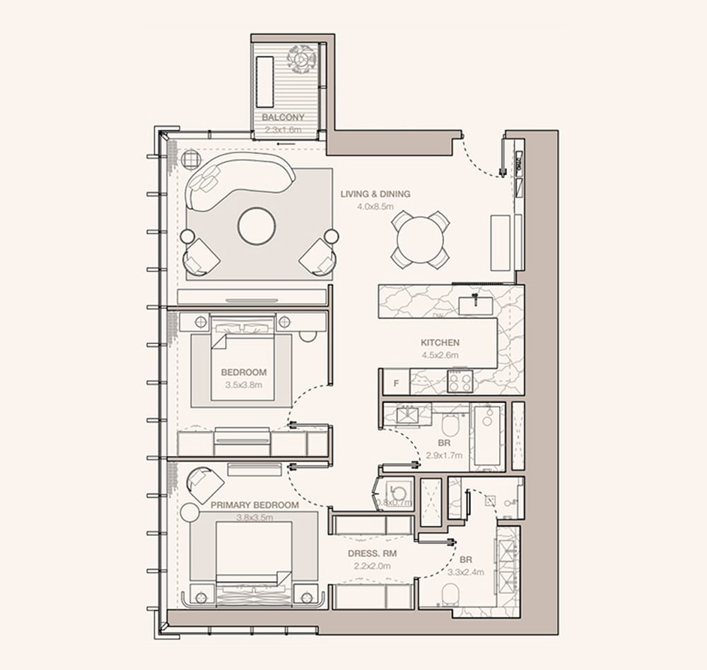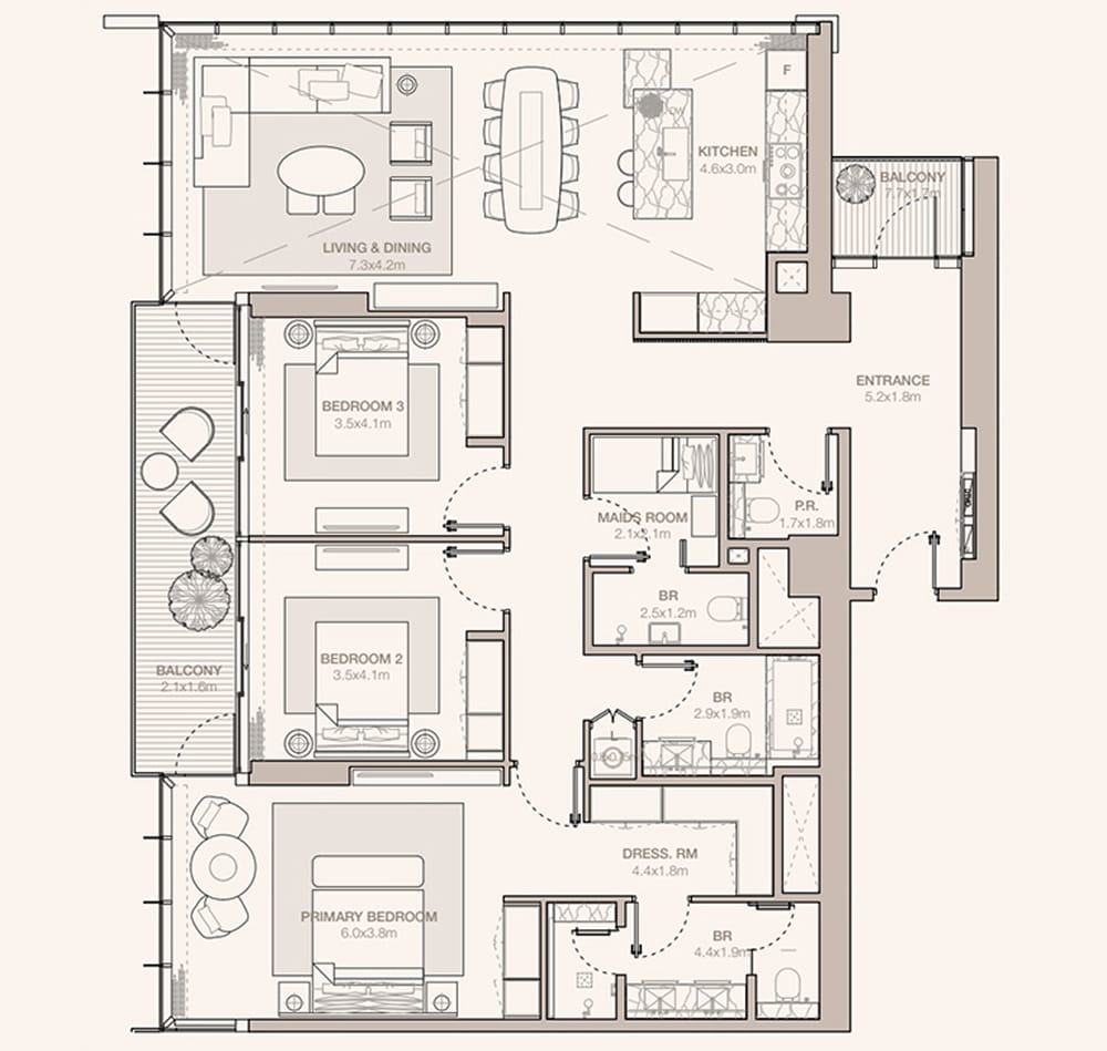 Crafted by the renowned SCDA architectural firm, the towers showcase a modern and sustainable design with a focus on elegance and comfort. Interiors are adorned with premium marble, wooden finishes, and warm tones that create a welcoming atmosphere. Expansive glass panels and clean lines emphasize natural light and provide residents with uninterrupted views of Dubai’s dynamic cityscape.